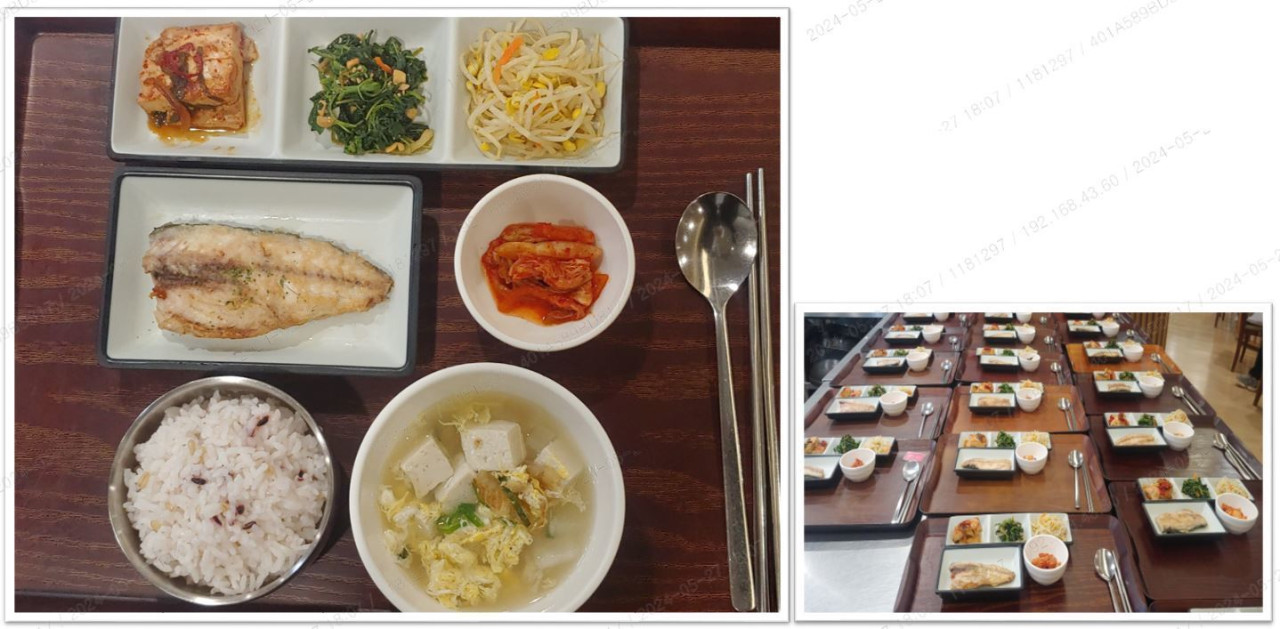 ○ 석식 : 황태계란무국/고등어구이/매콤두부조림/비름나물/콩나물무침/포기김치