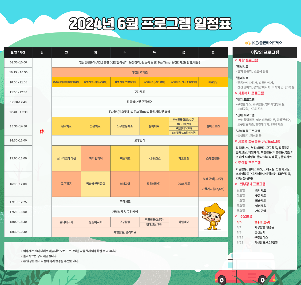 강동케어센터 [프로그램 안내] 2024년 강동케어센터 6월 프로그램 일정표 페이지 정보 작성자 KB 골든라이프케어 댓글 0건 조회 2,560회 작성일 24-05-30 09:36 목록 본문 목록 이전글[식단안내] 위례 케어센터 6월 2주차 식단표 24.05.30 다음글[식단안내] 2024년 강동케어센터 6월 식단표 24.05.30