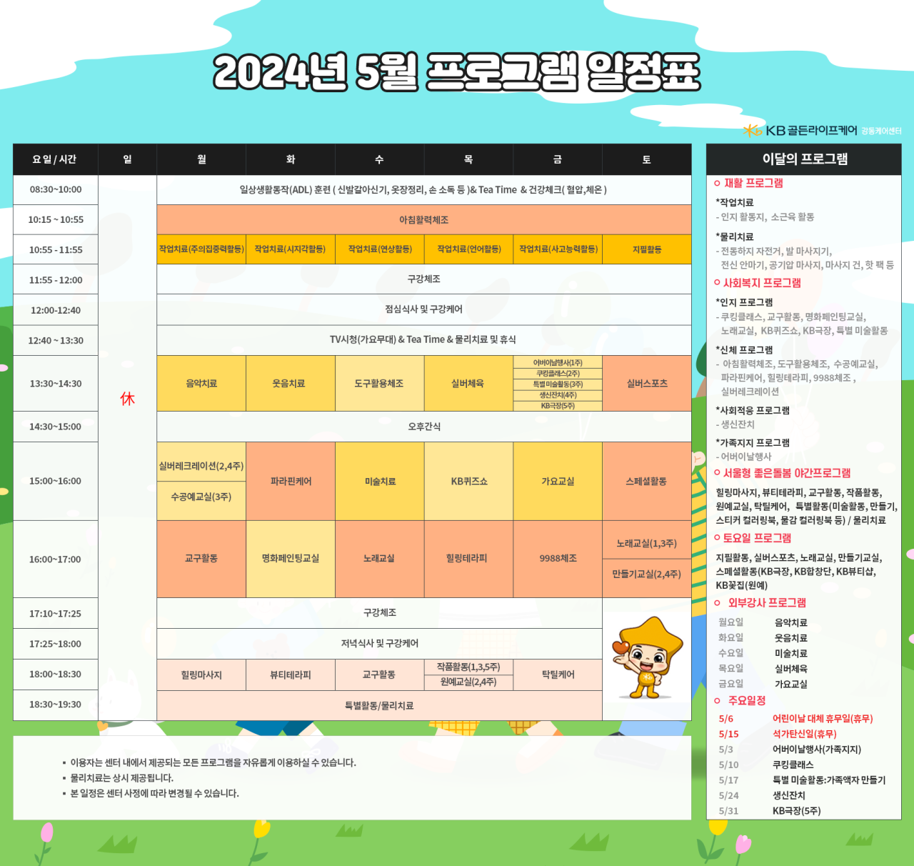 강동케어센터 [프로그램 안내] 2024년 강동케어센터 5월 프로그램 일정표 페이지 정보 작성자 KB 골든라이프케어 댓글 0건 조회 2,817회 작성일 24-04-30 17:55 목록 본문 목록 이전글[식단안내] 2024년 강동케어센터 5월 식단표 24.04.30 다음글[프로그램 안내] 2024년 위례케어센터 5월 프로그램 일정표 24.04.30