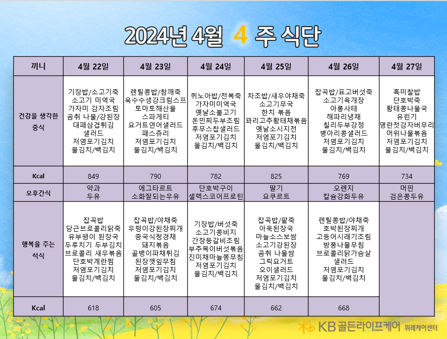 위례케어센터 [식단안내] 위례 케어센터 4월 4주차 식단표 페이지 정보 작성자 KB 골든라이프케어 댓글 0건 조회 2,367회 작성일 24-04-19 13:12 목록 본문 목록 이전글[오늘의 식단] 2024년 4월 22일 석식 24.04.23 다음글[식단안내] 위례 빌리지 4월 4주차 식단표 24.04.19