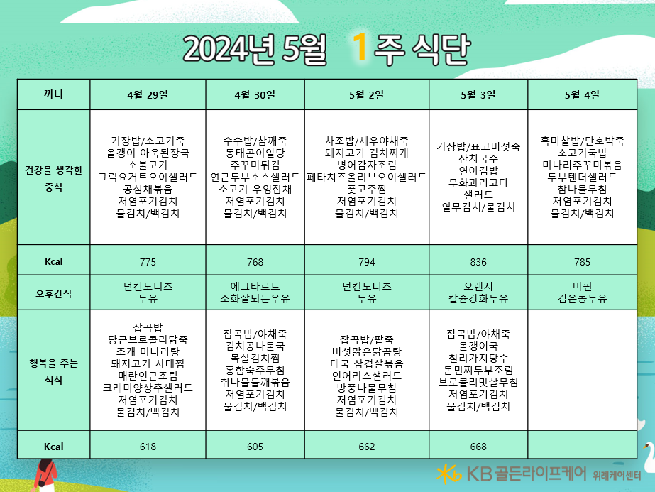 위례케어센터 [식단안내] 위례 케어센터 5월 1주차 식단표 페이지 정보 작성자 KB 골든라이프케어 댓글 0건 조회 2,424회 작성일 24-04-26 09:46 목록 본문 목록 이전글[식단안내] 위례 빌리지 5월 1주차 식단표 24.04.26 다음글[오늘의 식단] 2024년 4월 25일 석식 24.04.25