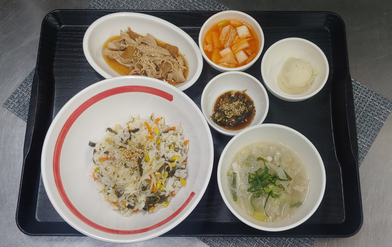 서초빌리지 [오늘의 식단] 2024년 4월 17일 중식 페이지 정보 작성자 KB 골든라이프케어 댓글 0건 조회 2,284회 작성일 24-04-17 21:21 목록 본문 04월17일 제공식단 봄나물취나물밥&달래장 / 들깨무채국 / 닭장조림 / 감자범벅 / 나박물김치 어르신들 드시기 좋게 취나물, 달래, 콩나물, 참나물, 당근을 짧게 썰어 쌀을 밥솥에 안치고, 닭살을 정성스레 찢어 미리 준비해둔 간장양념에 장시간 조립니다. 봄나물취나물밥에 나박물김치국물로 어르신들의 입안이 개운하도록 메뉴구성해 보았습니다. ^^ 오늘도 잔반제로 목록 이전글[식단안내] 서초 빌리지 4월 4주차 식단표 24.04.17 다음글[오늘의 식단] 2024년 4월 17일 중식 24.04.17