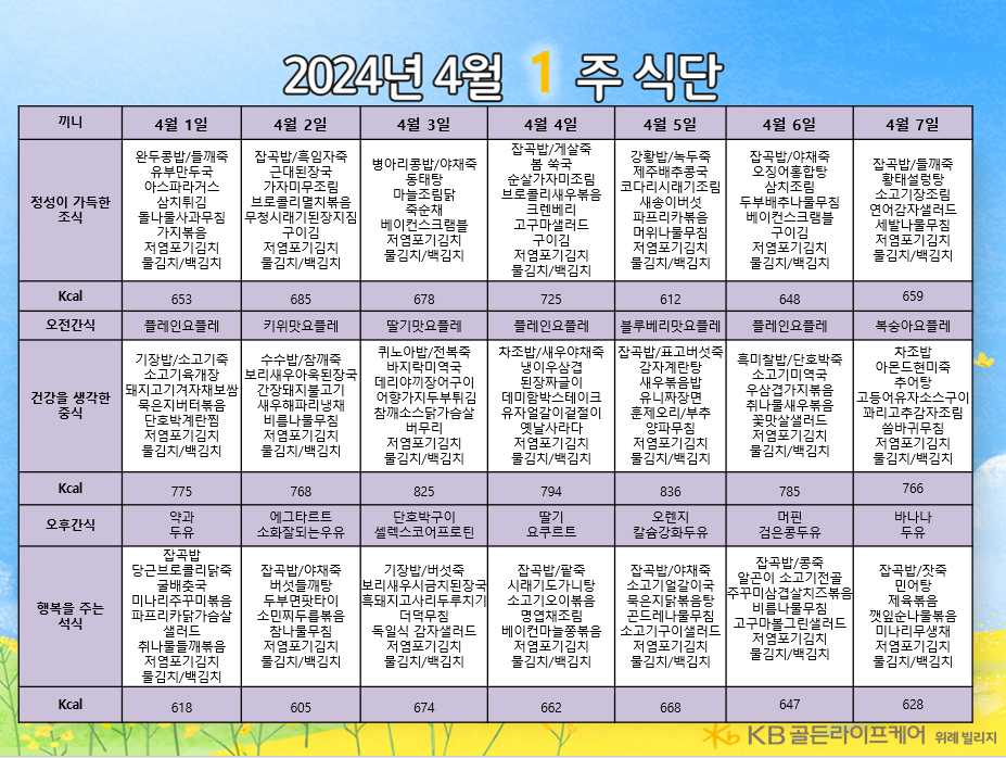위례빌리지 [식단안내] 위례 빌리지 4월 1주차 식단표 페이지 정보 작성자 KB 골든라이프케어 댓글 0건 조회 2,392회 작성일 24-03-28 17:56 목록 본문 목록 이전글[식단안내] 위례 케어센터 4월 1주차 식단표 24.03.28 다음글[오늘의 식단] 2024년 3월 28일 중식 24.03.28