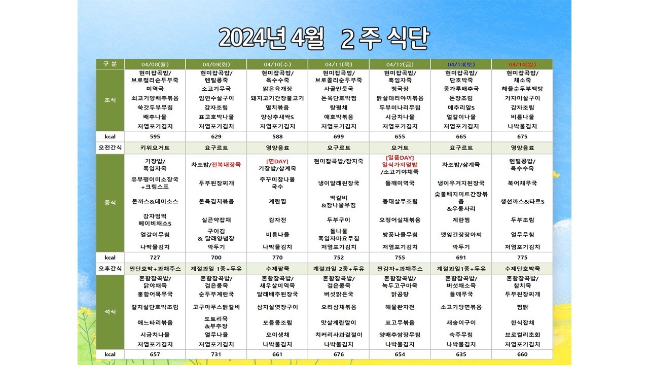 서초빌리지 [식단안내] 서초 빌리지 4월 2주차 식단표 페이지 정보 작성자 KB 골든라이프케어 댓글 0건 조회 2,236회 작성일 24-04-05 16:16 목록 본문 목록 이전글[오늘의 식단] 2024년 4월 9일 중식 24.04.09 다음글[오늘의 식단] 2024년 4월 5일 중식 24.04.05