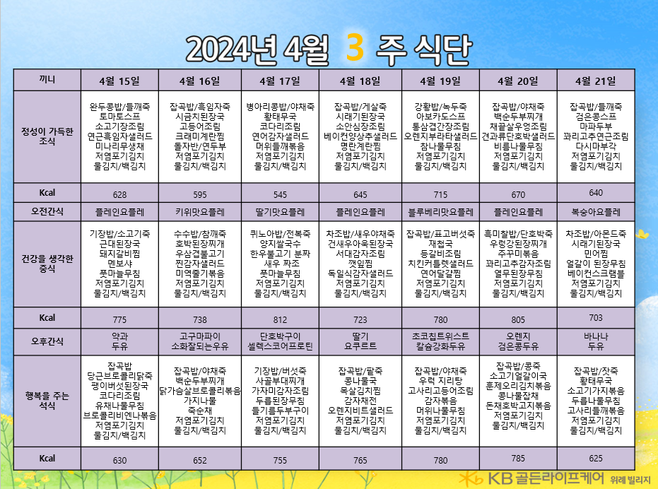 위례빌리지 [식단안내] 위례 빌리지 4월 3주차 식단표 페이지 정보 작성자 KB 골든라이프케어 댓글 0건 조회 2,408회 작성일 24-04-11 14:08 목록 본문 목록 이전글[오늘의식단]2024년 4월 9일 중식 24.04.11 다음글[식단안내] 위례 케어센터 4월 3주차 식단표 24.04.11