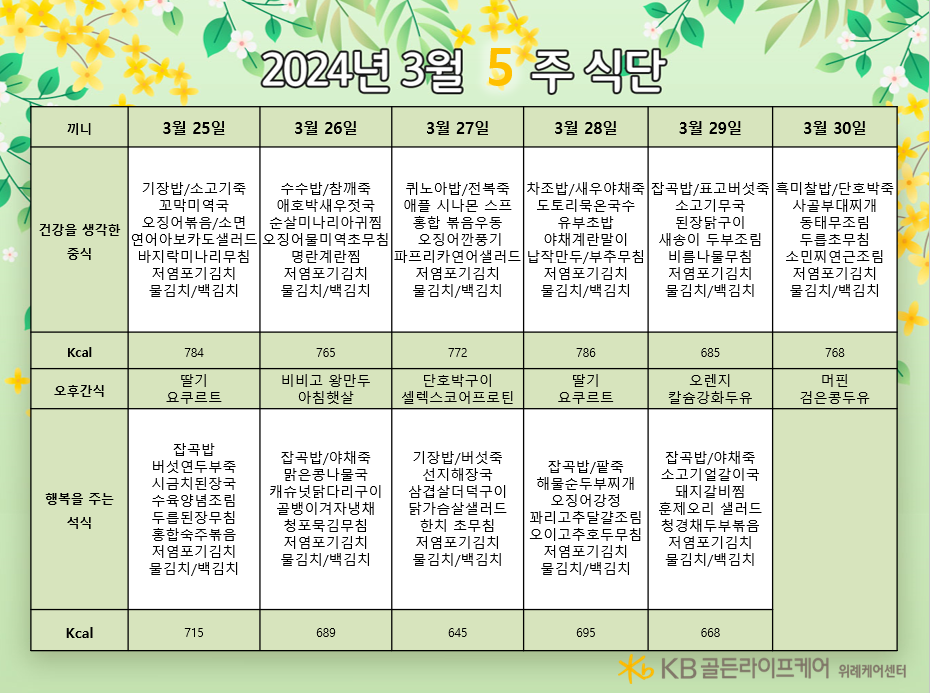 위례케어센터 [식단안내] 위례 케어센터 3월 5주차 식단표 페이지 정보 작성자 KB 골든라이프케어 댓글 0건 조회 2,263회 작성일 24-03-22 10:43 목록 본문 목록 이전글[식단안내] 서초 빌리지 3월 3주차 식단표 24.03.25 다음글[식단안내] 위례 빌리지 3월 5주차 식단표 24.03.22