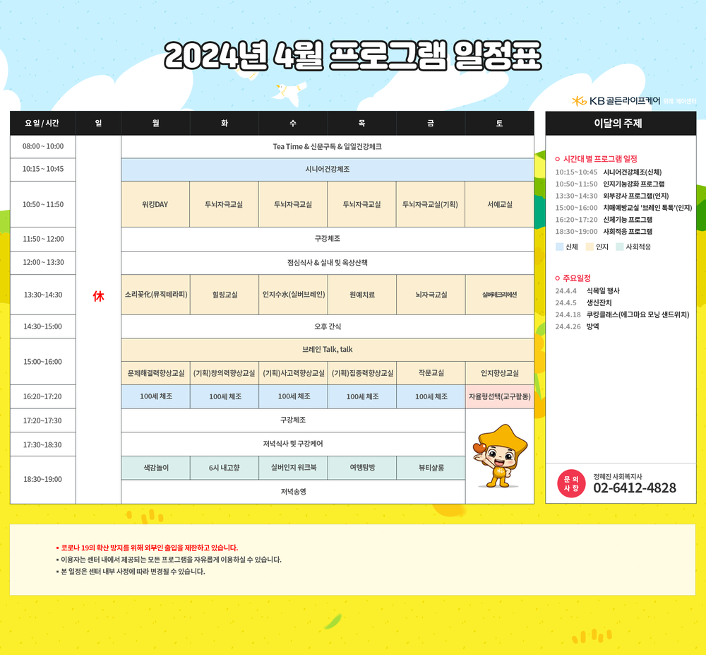 위례케어센터 [프로그램 안내] 2024년 위례케어센터 4월 프로그램 일정표 페이지 정보 작성자 KB 골든라이프케어 댓글 0건 조회 2,839회 작성일 24-03-26 18:37 목록 본문 목록 이전글[오늘의식단] 2024년 3월 28일 중식 24.03.28 다음글[오늘의 식단] 2024년 3월 26일 중식 24.03.26