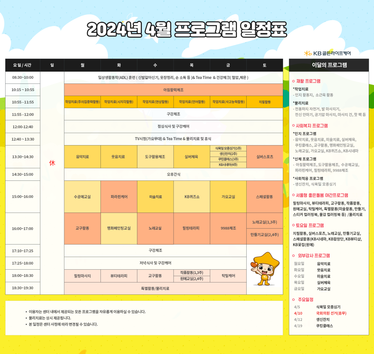 강동케어센터 [프로그램 안내] 2024년 강동케어센터 4월 프로그램 일정표 페이지 정보 작성자 KB 골든라이프케어 댓글 0건 조회 3,021회 작성일 24-03-28 15:31 목록 본문 목록 이전글[오늘의 식단] 2024년 3월 28일 중식 24.03.28 다음글[식단안내] 2024년 강동케어센터 4월 식단표 24.03.28