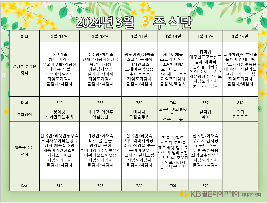 위례케어센터 [식단안내] 위례 케어센터 3월 3주차 식단표 페이지 정보 작성자 KB 골든라이프케어 댓글 0건 조회 2,284회 작성일 24-03-08 15:11 목록 본문 목록 이전글[식단안내] 위례 빌리지 3월 3주차 식단표 24.03.08 다음글[오늘의식단] 2024년 3월 8일 중식 24.03.08