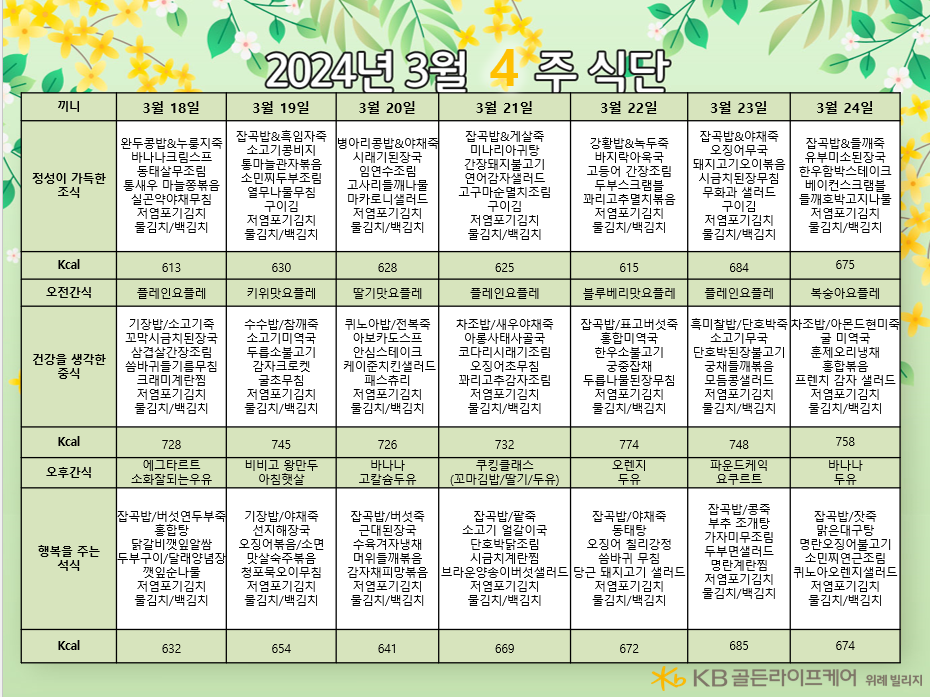 위례빌리지 [식단안내] 위례 빌리지 3월 4주차 식단표 페이지 정보 작성자 KB 골든라이프케어 댓글 0건 조회 2,400회 작성일 24-03-15 10:55 목록 본문 목록 이전글[식단안내] 위례 케어센터 3월 4주차 식단표 24.03.15 다음글[오늘의 식단] 2024년 3월 13일 중식 24.03.13