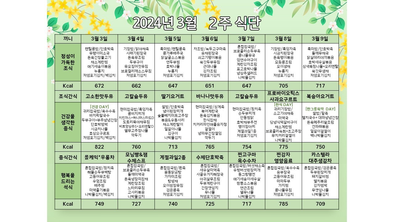서초빌리지 [식단안내] 서초 빌리지 3월 2주차 식단표 페이지 정보 작성자 KB 골든라이프케어 댓글 0건 조회 2,236회 작성일 24-02-29 16:40 목록 본문 목록 이전글[식단안내] 위례빌리지 3월 2주차 식단표 24.02.29 다음글[프로그램 안내] 2024년 강동케어센터 3월 프로그램 일정표 24.02.29