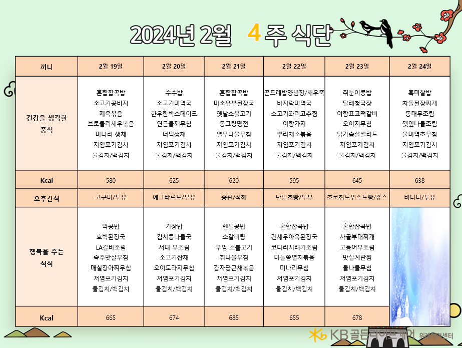 위례케어센터 [식단안내] 위례 케어센터 2월 4주차 식단표 페이지 정보 작성자 KB 골든라이프케어 댓글 0건 조회 2,594회 작성일 24-02-16 12:47 목록 본문 목록 이전글[식단안내] 위례 빌리지 2월 4주차 식단표 24.02.16 다음글[오늘의 식단] 2024년 2월 16일 중식 24.02.16