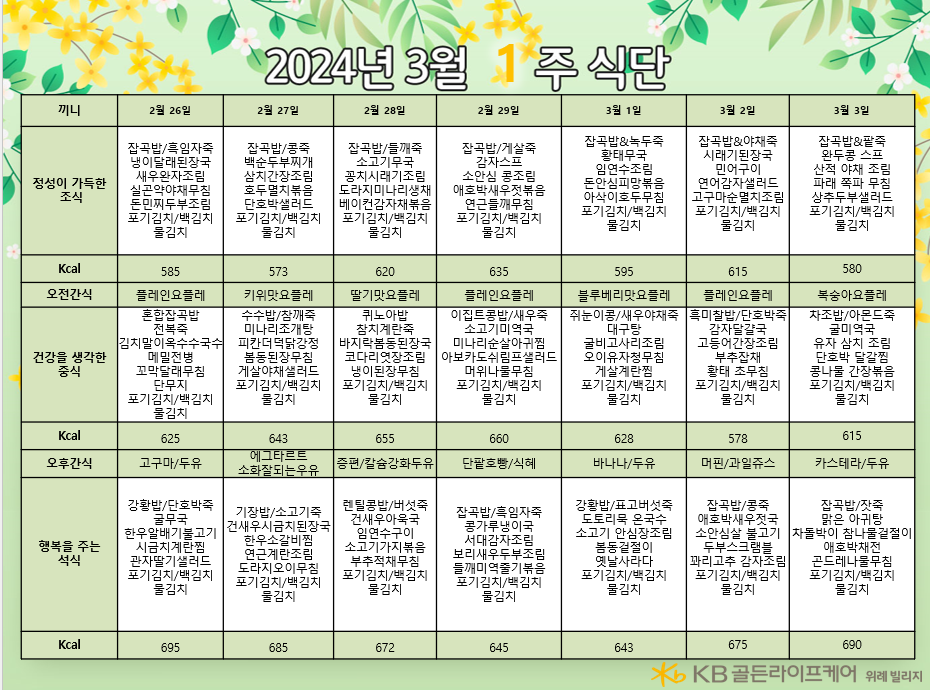 위례빌리지 [식단안내] 위례 빌리지 3월 1주차 식단표 페이지 정보 작성자 KB 골든라이프케어 댓글 0건 조회 2,354회 작성일 24-02-23 12:54 목록 본문 목록 이전글[식단안내] 위례 케어센터 3월 1주차 식단표 24.02.23 다음글[오늘의 식단]2024년 2월 23일 중식 24.02.23