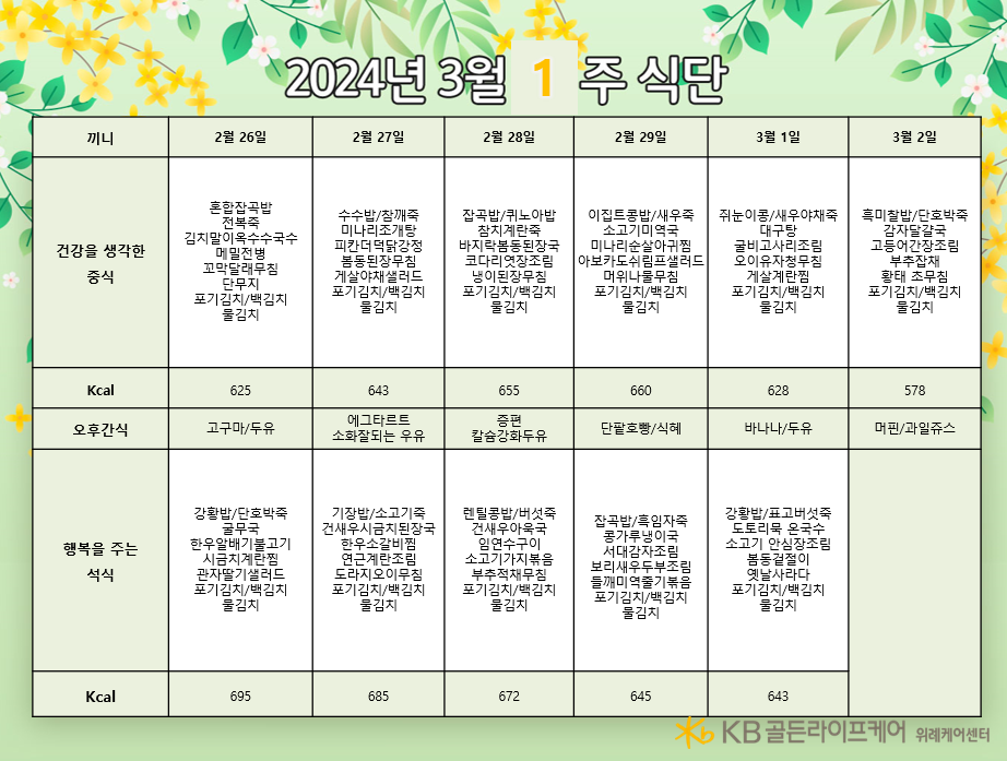 위례케어센터 [식단안내] 위례 케어센터 3월 1주차 식단표 페이지 정보 작성자 KB 골든라이프케어 댓글 0건 조회 2,811회 작성일 24-02-23 12:55 목록 본문 목록 이전글[오늘의 식단] 2024년 2월 26일 중식 24.02.26 다음글[식단안내] 위례 빌리지 3월 1주차 식단표 24.02.23