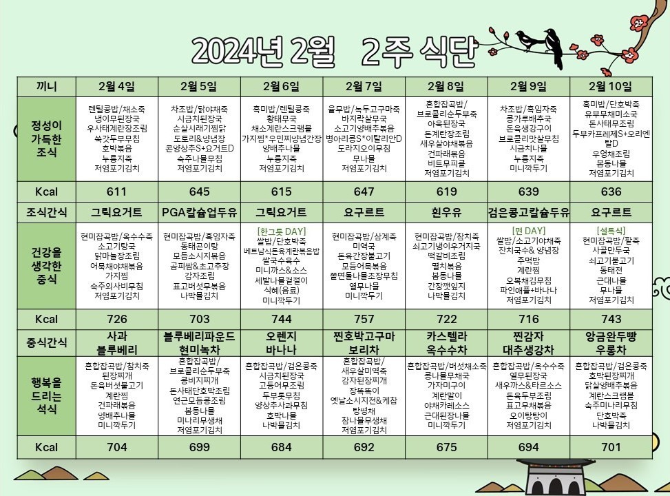 서초빌리지 [식단안내] 서초 빌리지 2월 2주차 식단표 페이지 정보 작성자 KB 골든라이프케어 댓글 0건 조회 2,283회 작성일 24-02-02 12:38 목록 본문 목록 이전글[오늘의 식단] 2024년 2월 2일 중식 24.02.02 다음글[오늘의 식단] 2024년 2월 1일 중식 24.02.01
