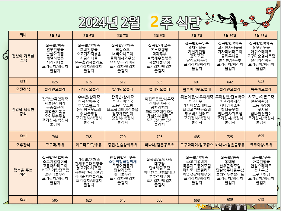 위례빌리지 [식단안내] 위례 빌리지 2월 2주차 식단표 페이지 정보 작성자 KB 골든라이프케어 댓글 0건 조회 2,442회 작성일 24-02-02 17:03 목록 본문 목록 이전글[식단안내] 위례 케어센터 2월 2주차 식단표 24.02.03 다음글[오늘의 식단] 2024년 2월 2일 중식 24.02.02