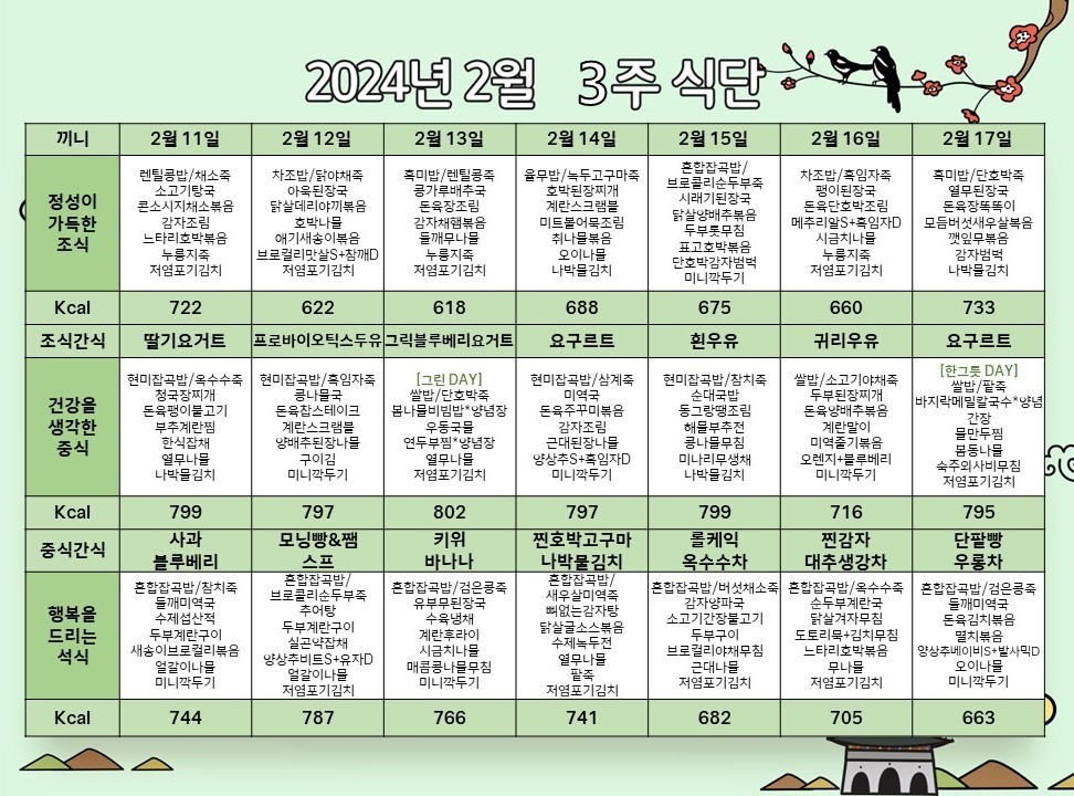서초빌리지 [식단안내] 서초 빌리지 2월 3주차 식단표 페이지 정보 작성자 KB 골든라이프케어 댓글 0건 조회 2,313회 작성일 24-02-08 17:49 목록 본문 목록 이전글[식단안내] 위례 빌리지 2월 3주차 식단표 24.02.09 다음글[오늘의 식단] 2024년 2월 6일 석식 24.02.07