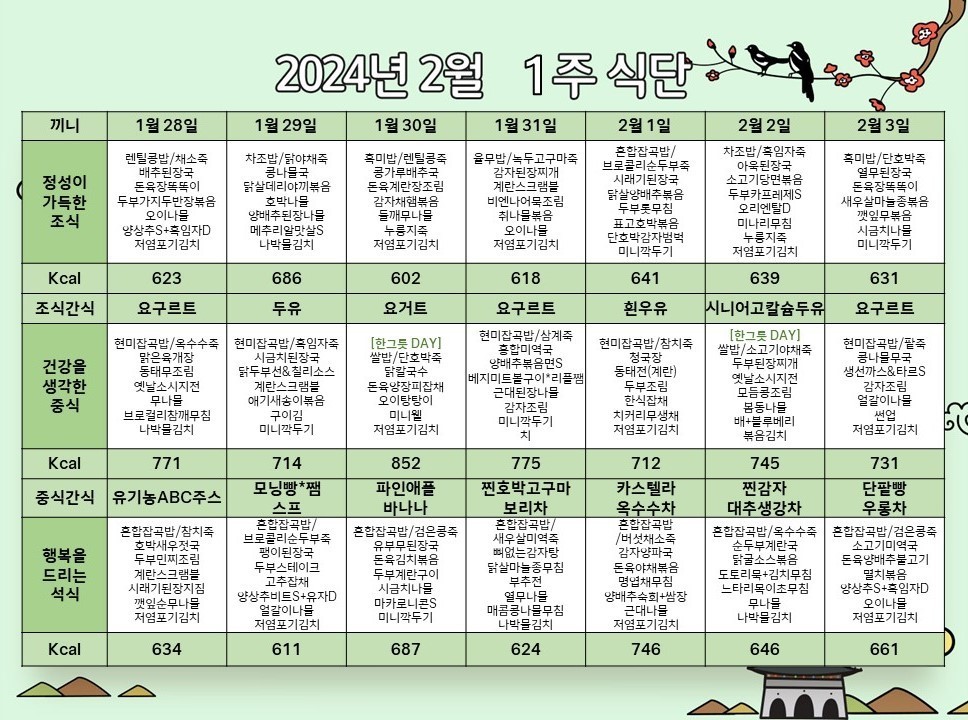 서초빌리지 [식단안내] 서초 빌리지 2월 1주차 식단표 페이지 정보 작성자 KB 골든라이프케어 댓글 0건 조회 2,315회 작성일 24-01-26 18:58 목록 본문 목록 이전글[오늘의식단] 2024년 1월 27일 중식 24.01.27 다음글[오늘의 식단] 2024년 1월 25일 중식 24.01.25