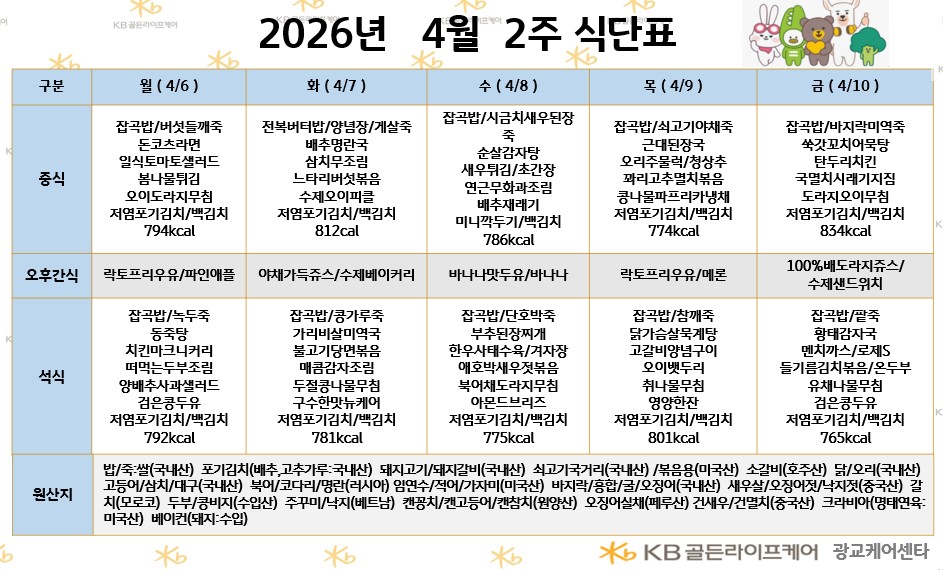 광교케어센터 [식단안내] 2026년 4월 2주 식단표 페이지 정보 작성자 최고관리자 댓글 0건 조회 2회 작성일 26-04-03 18:23 목록 본문 목록 다음글[하루의 식단] 2026년 4월 3일 하루식단 26.04.03