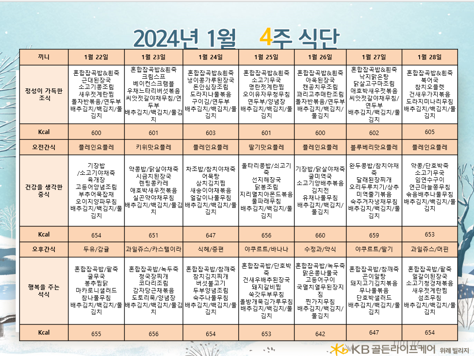 위례빌리지 [식단안내] 위례 빌리지 1월 4주차 식단표 페이지 정보 작성자 KB 골든라이프케어 댓글 0건 조회 2,338회 작성일 24-01-19 12:45 목록 본문 목록 이전글[오늘의 식단] 2024년 1월 19일 금요일 24.01.19 다음글[오늘의 식단] 2024년 1월 16일 화요일 24.01.16