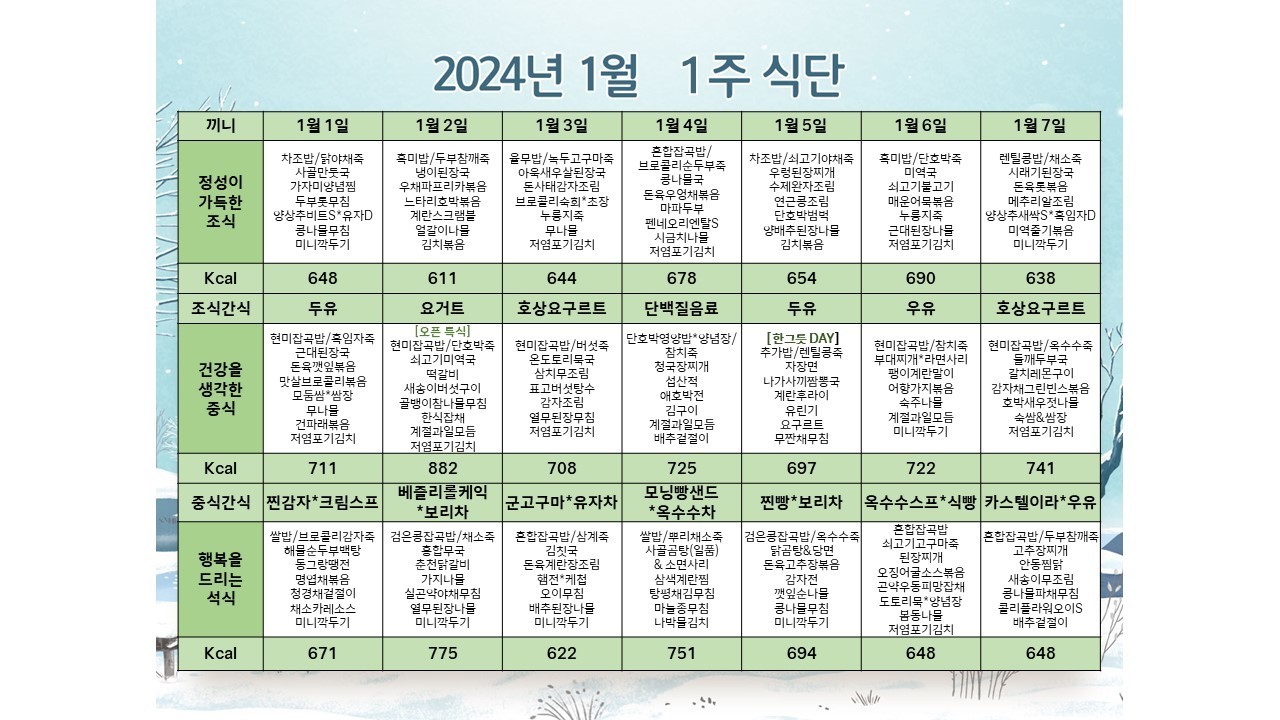 서초빌리지 [식단안내] 서초 빌리지 1월 1주차 식단표 페이지 정보 작성자 KB 골든라이프케어 댓글 0건 조회 2,403회 작성일 23-12-31 21:29 목록 본문 목록 이전글[프로그램 안내] 2024년 위례 빌리지 1월 프로그램 일정표 24.01.02 다음글[프로그램 안내] 2024년 위례케어센터 1월 프로그램 일정표 23.12.31
