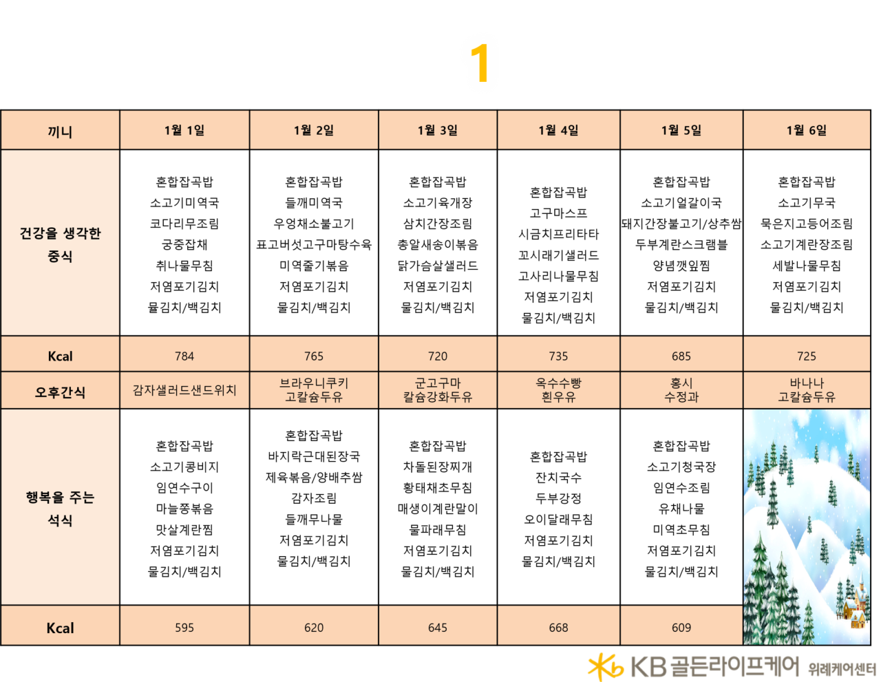 위례케어센터 [식단안내] 위례 케어센터 1월 1주차 식단표 페이지 정보 작성자 KB 골든라이프케어 댓글 0건 조회 2,347회 작성일 24-01-11 13:34 목록 본문 목록 이전글[오늘의 식단] 2024년 1월 11일 목요일 24.01.11 다음글[ 오늘의 식단 ] 2024년 1월 10일 수요일 24.01.10