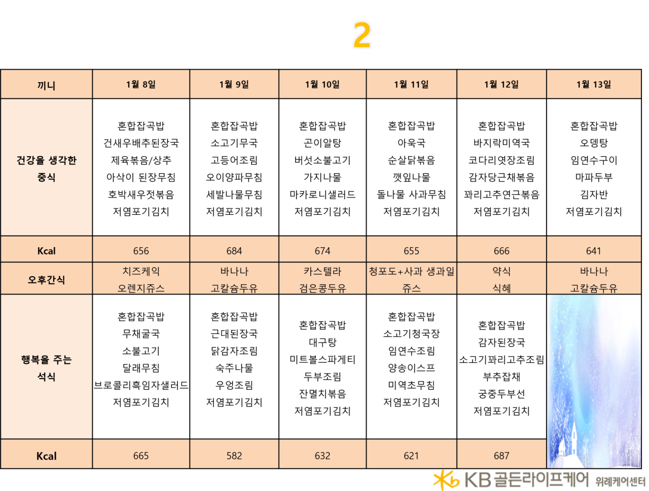 위례케어센터 [식단안내] 위례 케어센터 1월 2주차 식단표 페이지 정보 작성자 KB 골든라이프케어 댓글 0건 조회 2,304회 작성일 24-01-12 11:08 목록 본문 목록 이전글[식단안내] 위례 빌리지 1월 3주차 식단표 24.01.13 다음글[오늘의 식단] 2024년 1월 11일 목요일 24.01.11