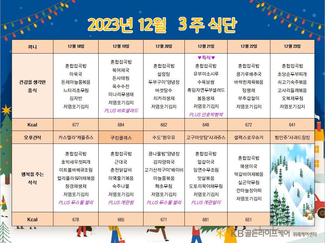 위례케어센터 [식단안내] 위례 케어센터 12월 3주차 식단표 페이지 정보 작성자 KB 골든라이프케어 댓글 0건 조회 2,403회 작성일 23-12-13 12:33 목록 본문 목록 이전글[오늘의 식단] 2023년 12월 13일 수요일 23.12.13 다음글[식단안내] 위례 빌리지 12월 3주차 식단표 23.12.13