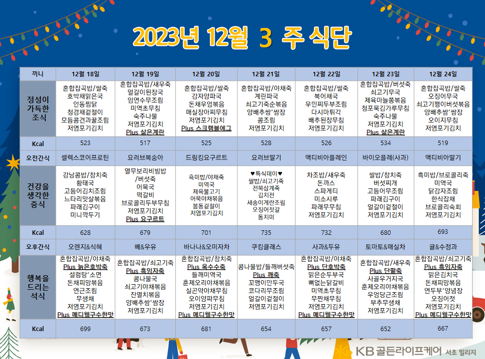 서초빌리지 [식단안내] 서초 빌리지 12월 3주차 식단표 페이지 정보 작성자 KB 골든라이프케어 댓글 0건 조회 2,276회 작성일 23-12-17 11:40 목록 본문 목록 이전글[ 오늘의 식단 ] 2023년 12월 18일 월요일 23.12.18 다음글[오늘의 식단] 2023년 12월 14일 목요일 23.12.14