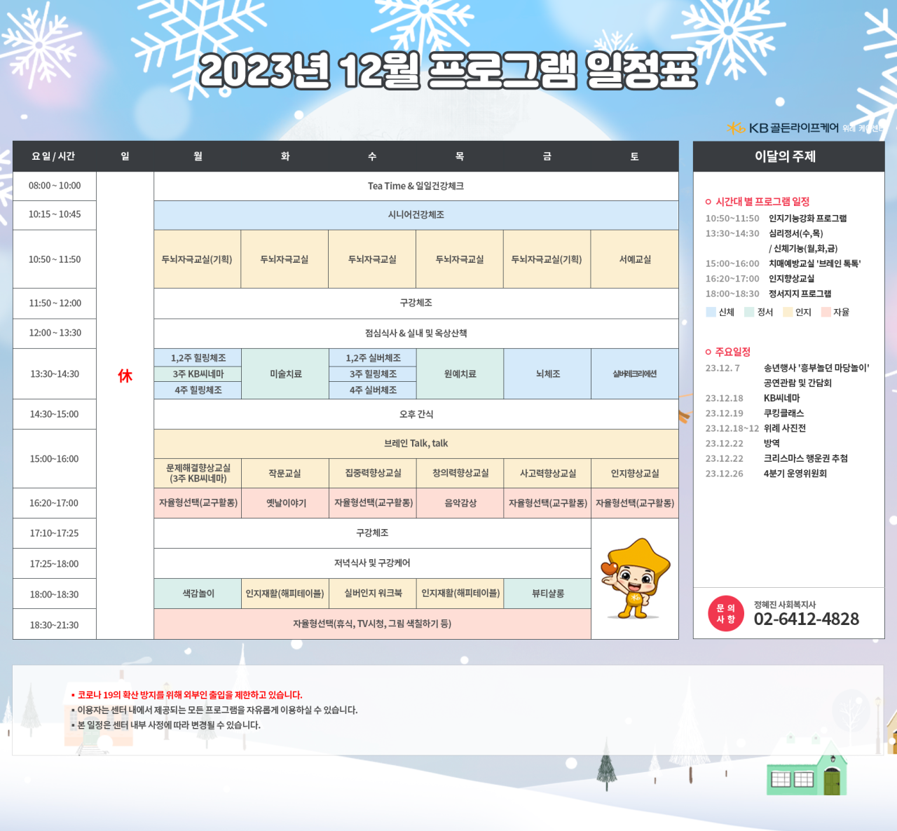 위례케어센터 [프로그램 안내] 2023년 위례케어센터 12월 프로그램 일정표 페이지 정보 작성자 KB 골든라이프케어 댓글 0건 조회 2,870회 작성일 23-11-27 17:14 목록 본문 목록 이전글[프로그램 안내] 2023년 위례 빌리지 12월 프로그램 일정표 23.11.27 다음글[식단안내] 위례 빌리지 11월 4주차 식단표 23.11.26