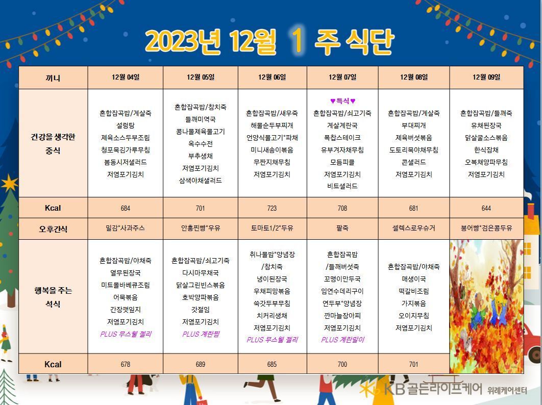 위례케어센터 [식단안내] 위례 케어센터 12월 1주차 식단표 페이지 정보 작성자 KB 골든라이프케어 댓글 0건 조회 2,349회 작성일 23-11-29 09:58 목록 본문 목록 이전글[프로그램 안내] 2023년 강동케어센터 12월 프로그램 일정표 23.11.30 다음글[식단안내] 위례 빌리지 12월 1주차 식단표 23.11.29