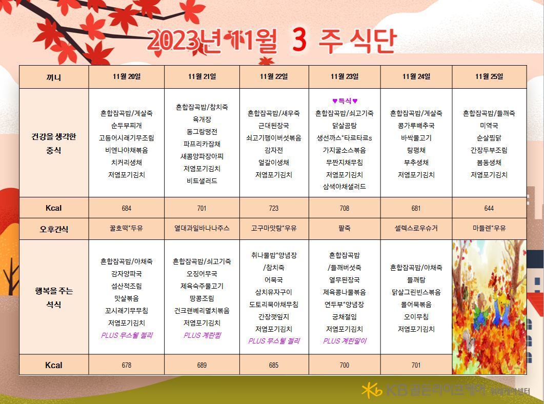 위례케어센터 [식단안내] 위례 케어센터 11월 3주차 식단표 페이지 정보 작성자 KB 골든라이프케어 댓글 0건 조회 2,334회 작성일 23-11-15 13:36 목록 본문 목록 이전글[식단안내] 위례 빌리지 11월 3주차 식단표 23.11.15 다음글[ 오늘의 식단 ] 2023년 11월 14일 화요일 23.11.14