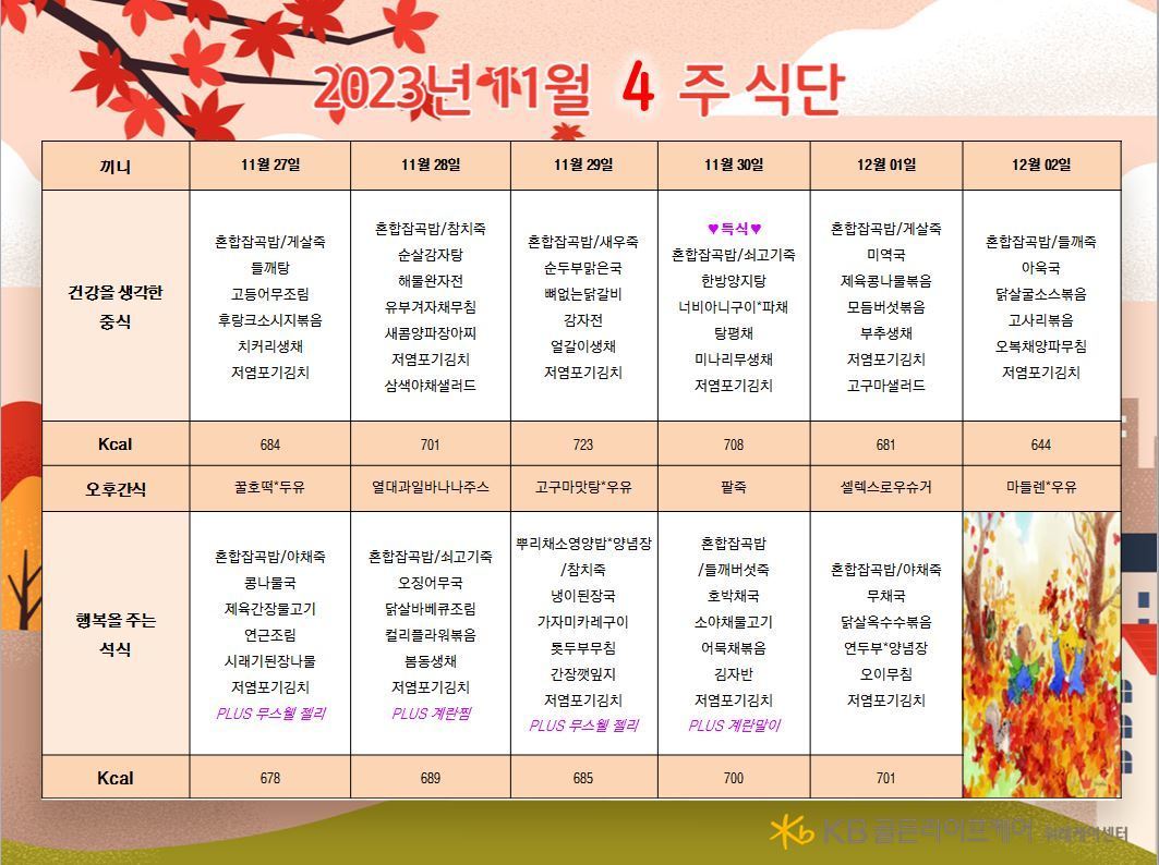 위례케어센터 [식단안내] 위례 케어센터 11월 4주차 식단표 페이지 정보 작성자 KB 골든라이프케어 댓글 0건 조회 2,347회 작성일 23-11-26 08:19 목록 본문 목록 이전글[식단안내] 위례 빌리지 11월 4주차 식단표 23.11.26 다음글[식단안내] 서초 빌리지 11월 4주차 식단표 23.11.24