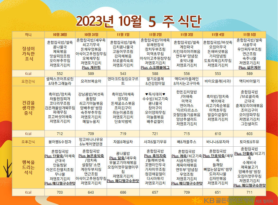 서초빌리지 [식단안내] 서초 빌리지 10월 5주차 식단표 페이지 정보 작성자 KB 골든라이프케어 댓글 0건 조회 2,369회 작성일 23-10-28 16:37 목록 본문 목록 이전글[프로그램안내] 2023년 서초 빌리지 11월 프로그램 일정표 23.10.30 다음글[식단안내] 위례 빌리지 10월 5주차 식단표 23.10.27