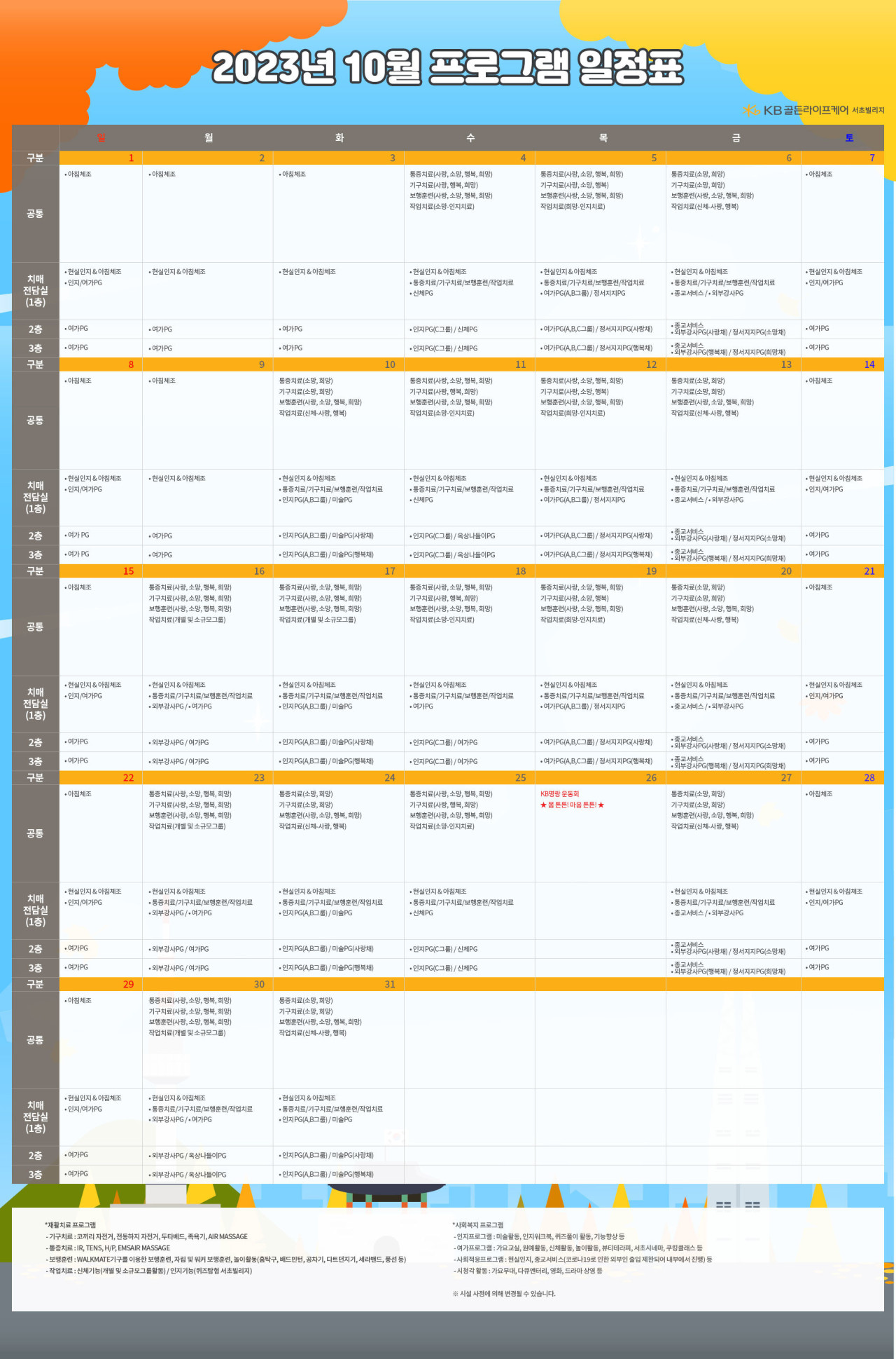 서초빌리지 [프로그램안내] 2023년 서초 빌리지 10월 프로그램 일정표 페이지 정보 작성자 KB 골든라이프케어 댓글 0건 조회 3,361회 작성일 23-10-04 17:31 목록 본문 목록 이전글[식단안내] 위례 케어센터 10월 2주차 식단표 23.10.06 다음글[ 오늘의 식단 ] 2023년 10월 4일 수요일 23.10.04