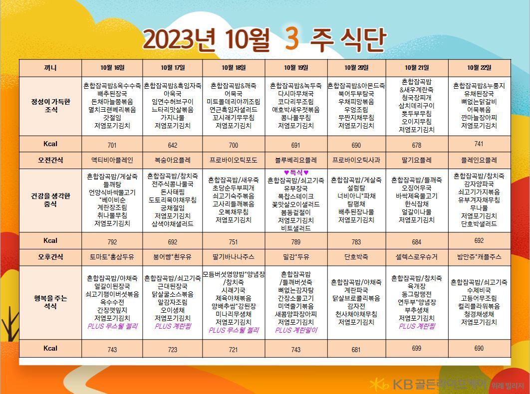 위례빌리지 [식단안내] 위례 빌리지 10월 3주차 식단표 페이지 정보 작성자 KB 골든라이프케어 댓글 0건 조회 2,506회 작성일 23-10-12 09:52 목록 본문 목록 이전글[식단안내] 서초 빌리지 10월 3주차 식단표 23.10.13 다음글[식단안내] 위례 케어센터 10월 3주차 식단표 23.10.12
