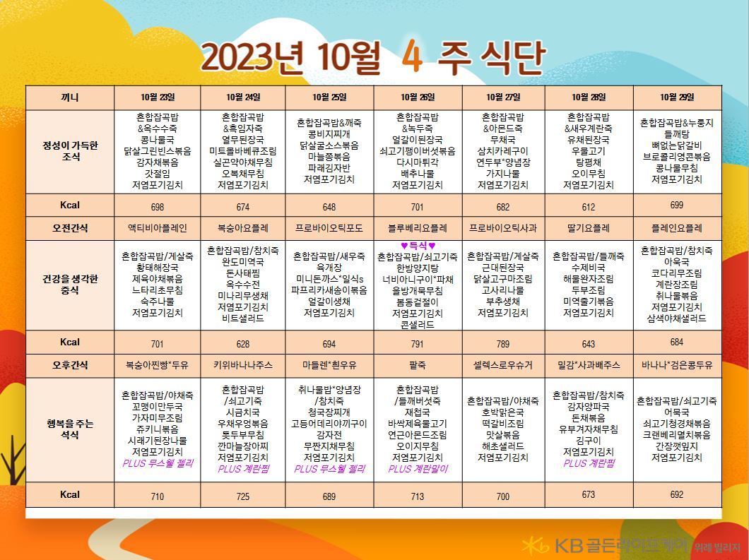 위례빌리지 [식단안내] 위례 빌리지 10월 4주차 식단표 페이지 정보 작성자 KB 골든라이프케어 댓글 0건 조회 2,420회 작성일 23-10-21 10:25 목록 본문 목록 이전글[식단안내] 위례 케어센터 10월 4주차 식단표 23.10.21 다음글[오늘의 식단] 2023년 10월 18일 수요일 23.10.18