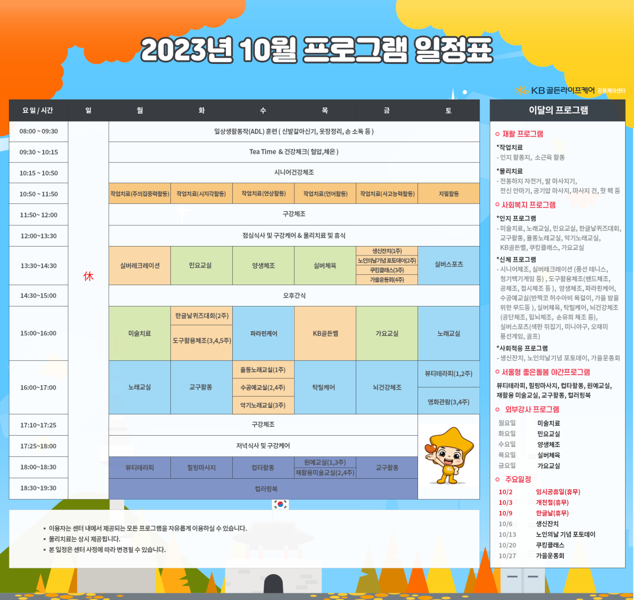 강동케어센터 [프로그램 안내] 2023년 강동케어센터 10월 프로그램 일정표 페이지 정보 작성자 KB 골든라이프케어 댓글 0건 조회 3,164회 작성일 23-09-22 17:26 목록 본문 목록 이전글[식단안내] 2023년 강동케어센터 10월 식단표 23.09.22 다음글[오늘의 식단] 2023년 9월21일 목요일 23.09.21