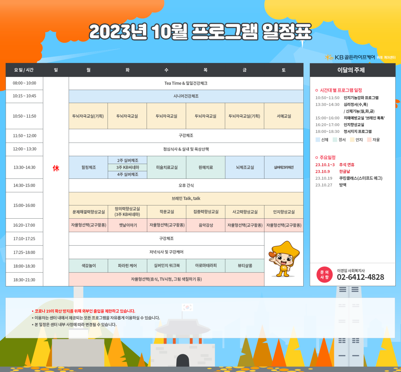 위례케어센터 [프로그램 안내] 2023년 위례케어센터 10월 프로그램 일정표 페이지 정보 작성자 KB 골든라이프케어 댓글 0건 조회 2,539회 작성일 23-09-26 10:09 목록 본문 목록 이전글[프로그램 안내] 2023년 위례 빌리지 10월 프로그램 일정표 23.09.26 다음글[오늘의 식단] 2023년 9월 25일 월요일 23.09.25