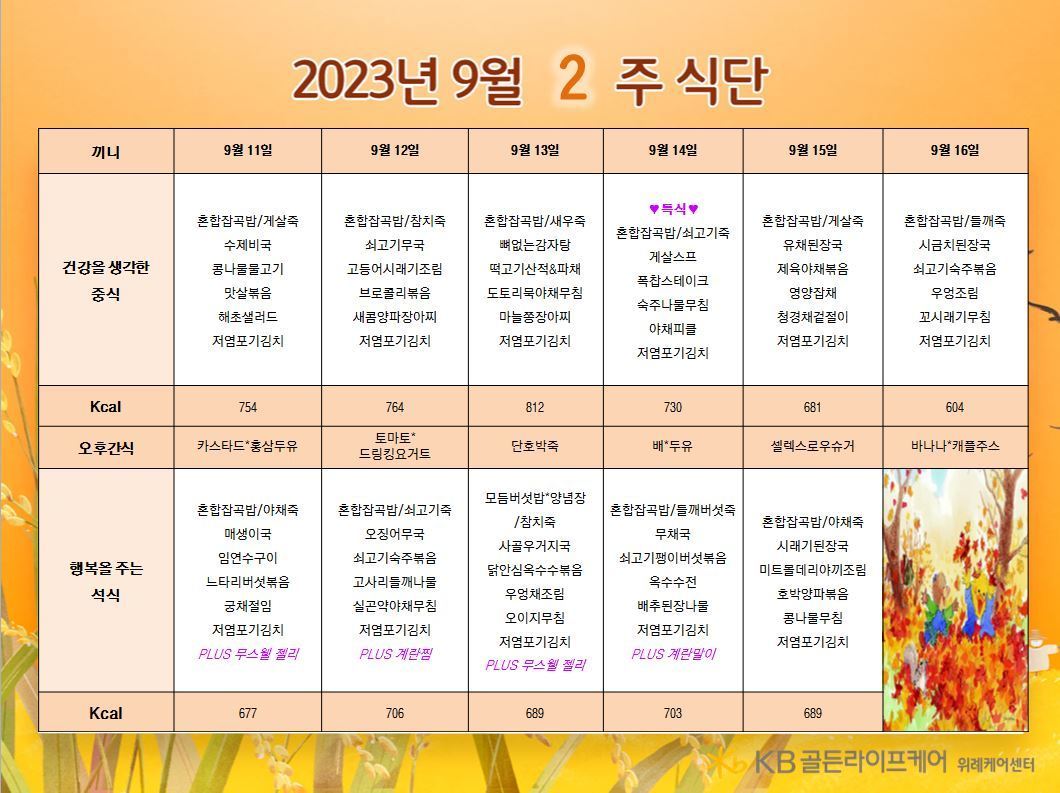 위례케어센터 [식단안내] 위례 케어센터 9월 2주차 식단표 페이지 정보 작성자 KB 골든라이프케어 댓글 0건 조회 2,372회 작성일 23-09-13 09:30 목록 본문 목록 이전글[식단안내] 위례 빌리지 9월 2주차 식단표 23.09.13 다음글[ 오늘의 식단 ] 2023년 9월 12일 화요일 23.09.12