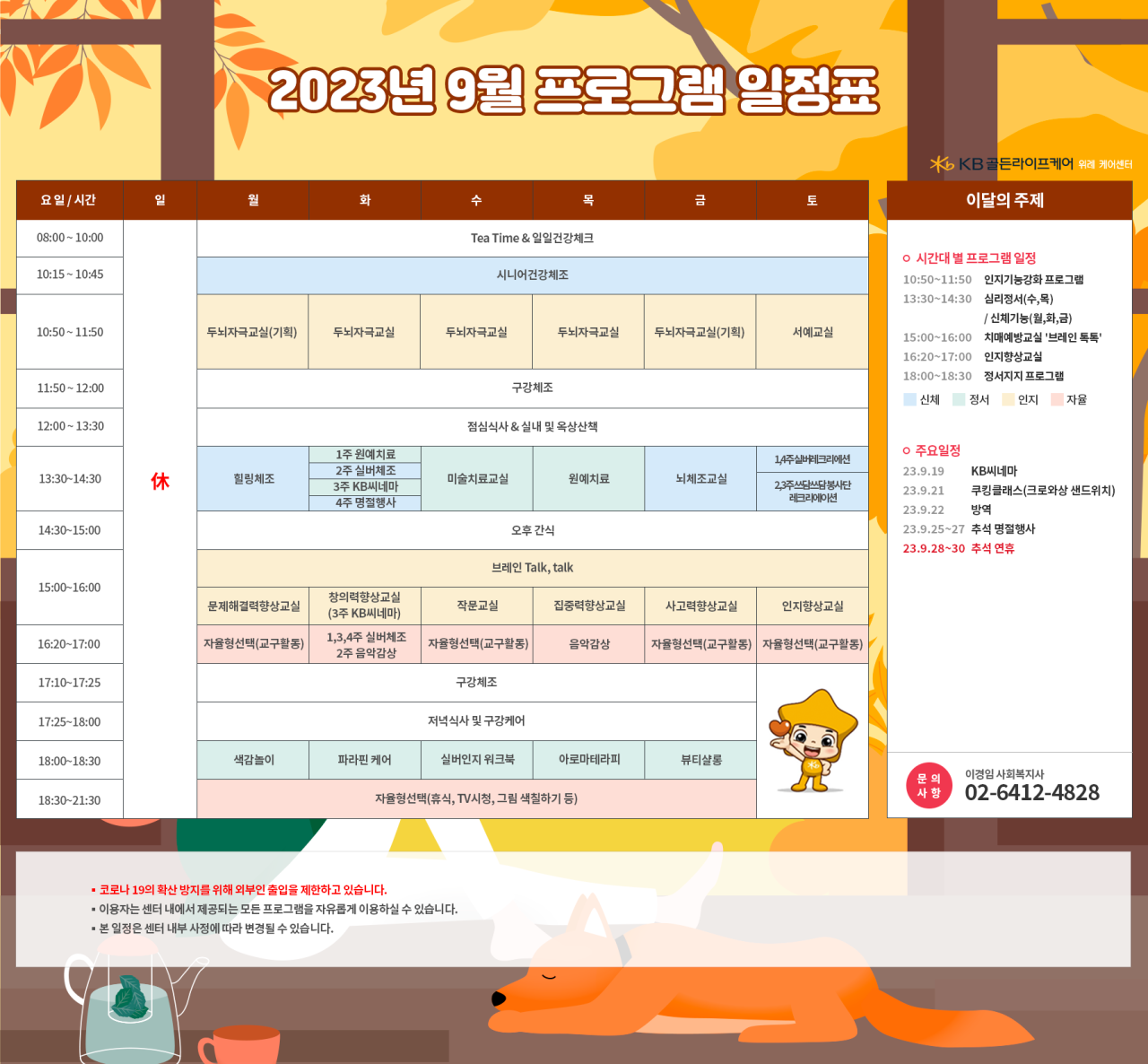 위례케어센터 [프로그램 안내] 2023년 위례케어센터 9월 프로그램 일정표 페이지 정보 작성자 KB 골든라이프케어 댓글 0건 조회 3,356회 작성일 23-08-30 17:03 목록 본문 목록 이전글[프로그램안내] 2023년 서초 빌리지 9월 프로그램 일정표 23.08.30 다음글[식단안내] 2023년 강동케어센터 9월 식단표 23.08.30