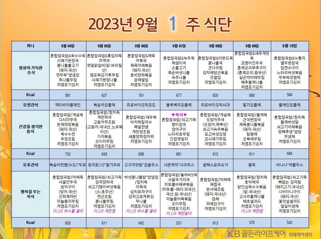 위례빌리지 [식단안내] 위례 빌리지 9월 1주차 식단표 페이지 정보 작성자 KB 골든라이프케어 댓글 0건 조회 2,392회 작성일 23-09-01 08:56 목록 본문 목록 이전글[식단안내] 위례 케어센터 9월 1주차 식단표 23.09.01 다음글[프로그램 안내] 2023년 위례 빌리지 9월 프로그램 일정표 23.08.31