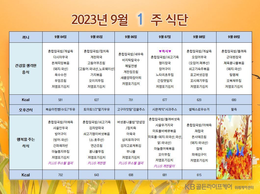 위례케어센터 [식단안내] 위례 케어센터 9월 1주차 식단표 페이지 정보 작성자 KB 골든라이프케어 댓글 0건 조회 2,468회 작성일 23-09-01 09:05 목록 본문 목록 이전글[식단안내] 서초 빌리지 9월 1주차 식단표 23.09.01 다음글[식단안내] 위례 빌리지 9월 1주차 식단표 23.09.01