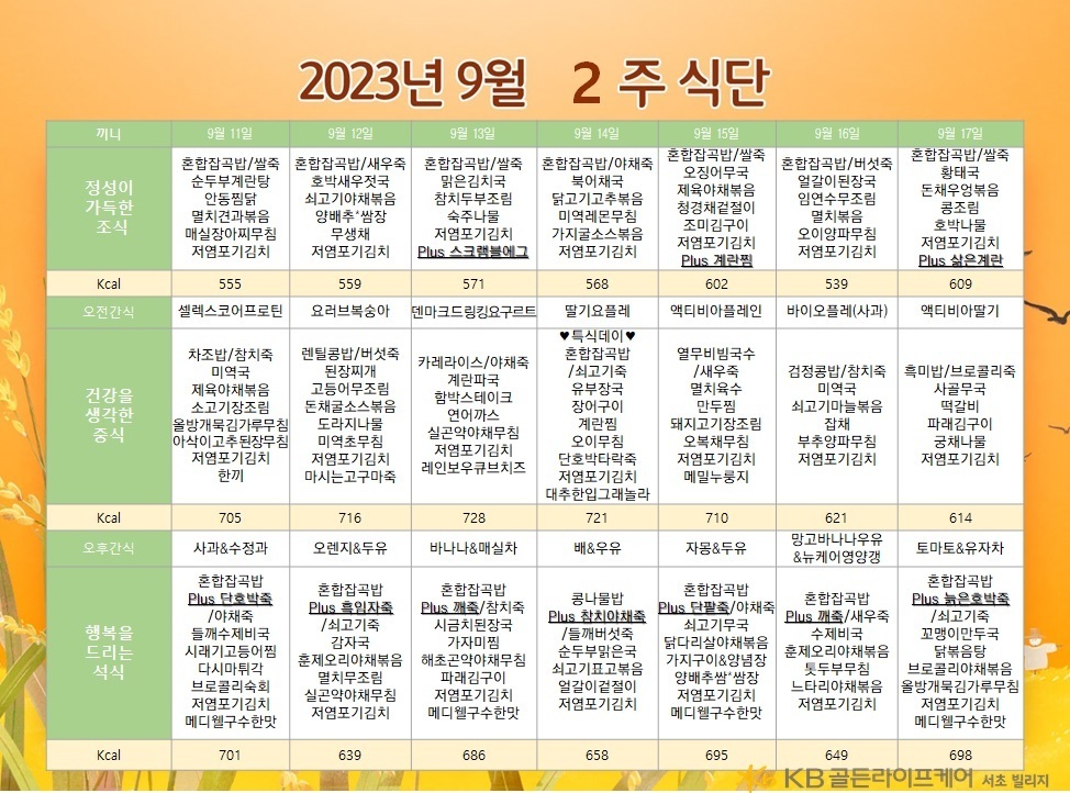 서초빌리지 [식단안내] 서초 빌리지 9월 2주차 식단표 페이지 정보 작성자 KB 골든라이프케어 댓글 0건 조회 2,287회 작성일 23-09-08 19:02 목록 본문 목록 이전글[오늘의 식단] 2023년 9월 9일 토요일 23.09.10 다음글[ 오늘의 식단 ] 2023년 9월 6일 수요일 23.09.06