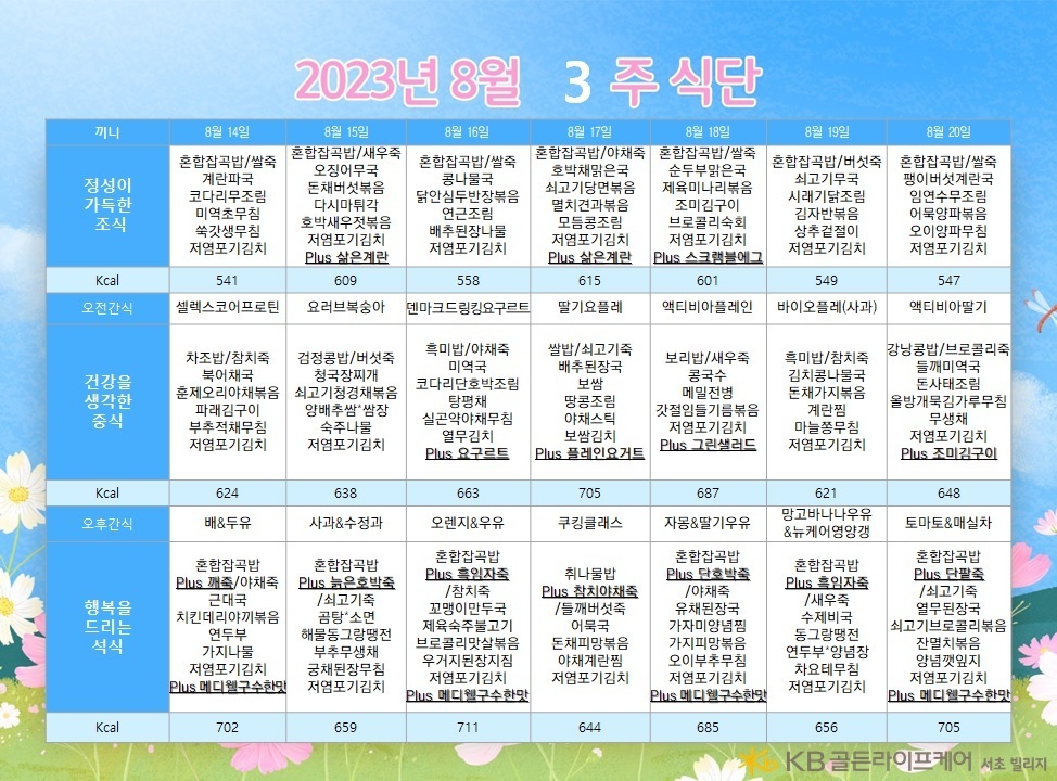 서초빌리지 [식단안내] 서초 빌리지 8월 3주차 식단표 페이지 정보 작성자 KB 골든라이프케어 댓글 0건 조회 2,299회 작성일 23-08-11 18:02 목록 본문 목록 이전글[오늘의 식단] 2023년 8월16일 수요일 23.08.16 다음글[오늘의 식단] 2023년 8월9일 수요일 23.08.09