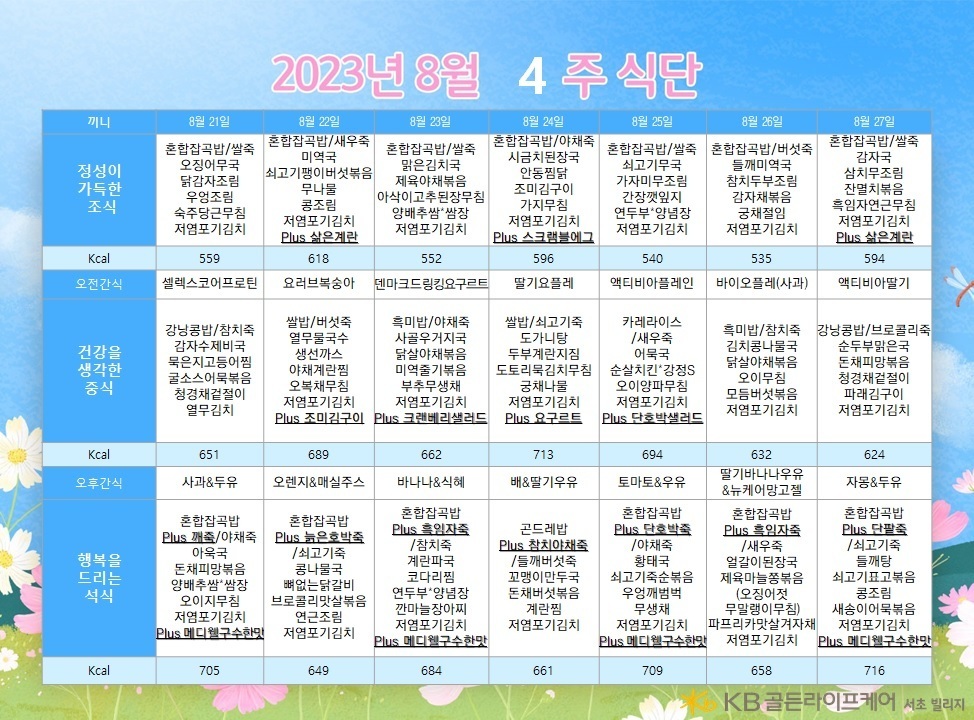 서초빌리지 [식단안내] 서초 빌리지 8월 4주차 식단표 페이지 정보 작성자 KB 골든라이프케어 댓글 0건 조회 2,341회 작성일 23-08-18 18:29 목록 본문 목록 이전글[오늘의 식단] 2023년 8월 22일 화요일 23.08.22 다음글[오늘의 식단] 2023년 8월 16일 수요일 23.08.16