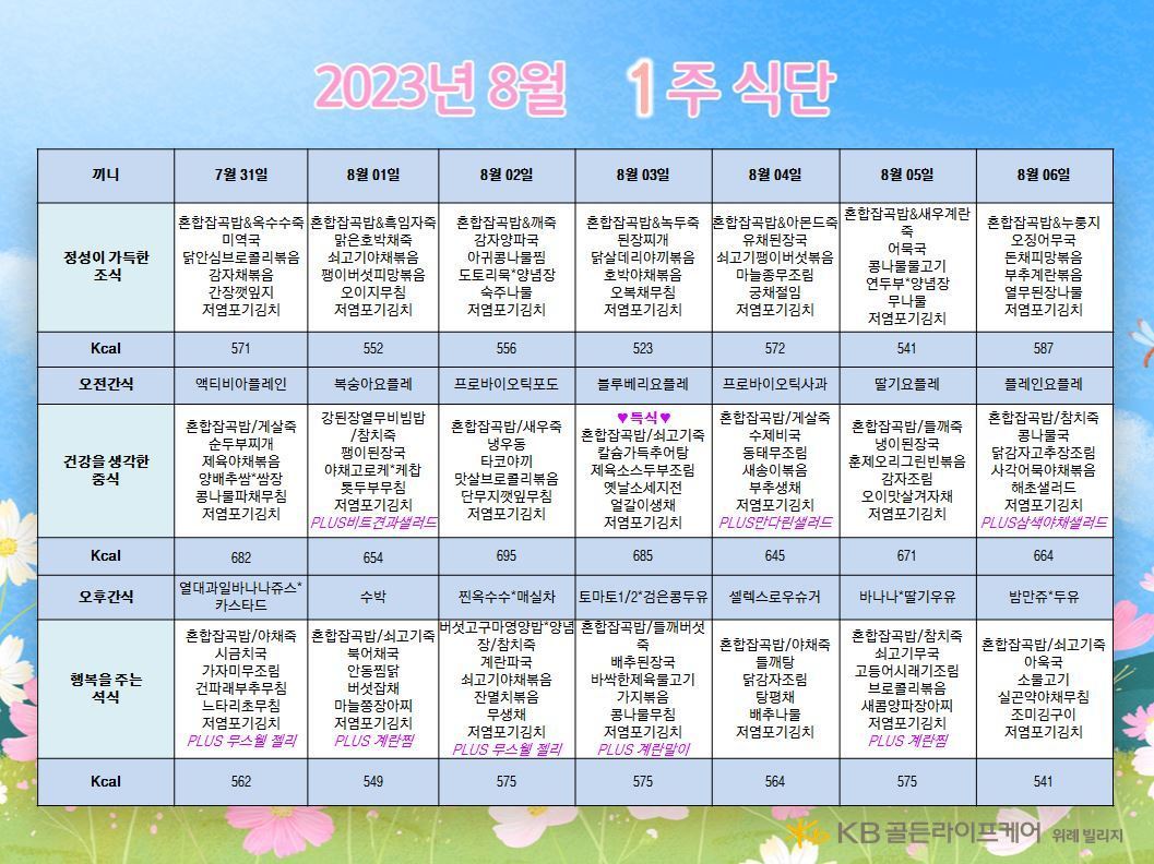 위례빌리지 [식단안내] 위례 빌리지 8월 1주차 식단표 페이지 정보 작성자 KB 골든라이프케어 댓글 0건 조회 2,374회 작성일 23-07-27 14:49 목록 본문 목록 이전글[식단안내] 위례 케어센터 8월 1주차 식단표 23.07.27 다음글[식단안내] 서초 빌리지 8월 1주차 식단표 23.07.26