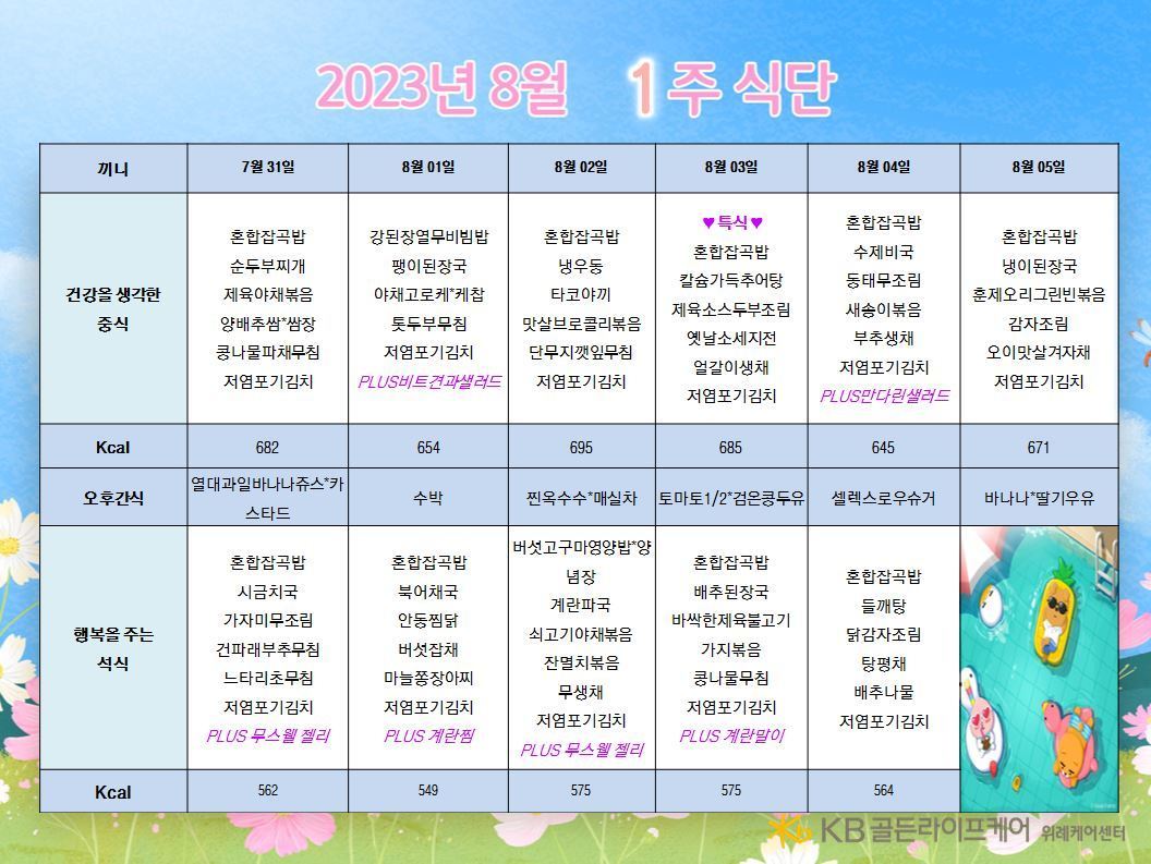 위례케어센터 [식단안내] 위례 케어센터 8월 1주차 식단표 페이지 정보 작성자 KB 골든라이프케어 댓글 0건 조회 2,430회 작성일 23-07-27 14:49 목록 본문 목록 이전글[ 오늘의 식단 ] 2023년 7월 27일 목요일 23.07.27 다음글[식단안내] 위례 빌리지 8월 1주차 식단표 23.07.27