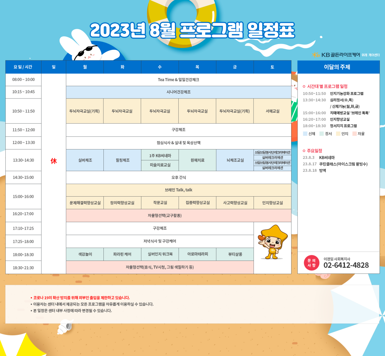 위례케어센터 [프로그램 안내] 2023년 위례케어센터 8월 프로그램 일정표 페이지 정보 작성자 KB 골든라이프케어 댓글 0건 조회 3,265회 작성일 23-07-28 15:24 목록 본문 목록 이전글[프로그램 안내] 2023년 강동케어센터 8월 프로그램 일정표 23.07.28 다음글[프로그램 안내] 2023년 위례 빌리지 8월 프로그램 일정표 23.07.28