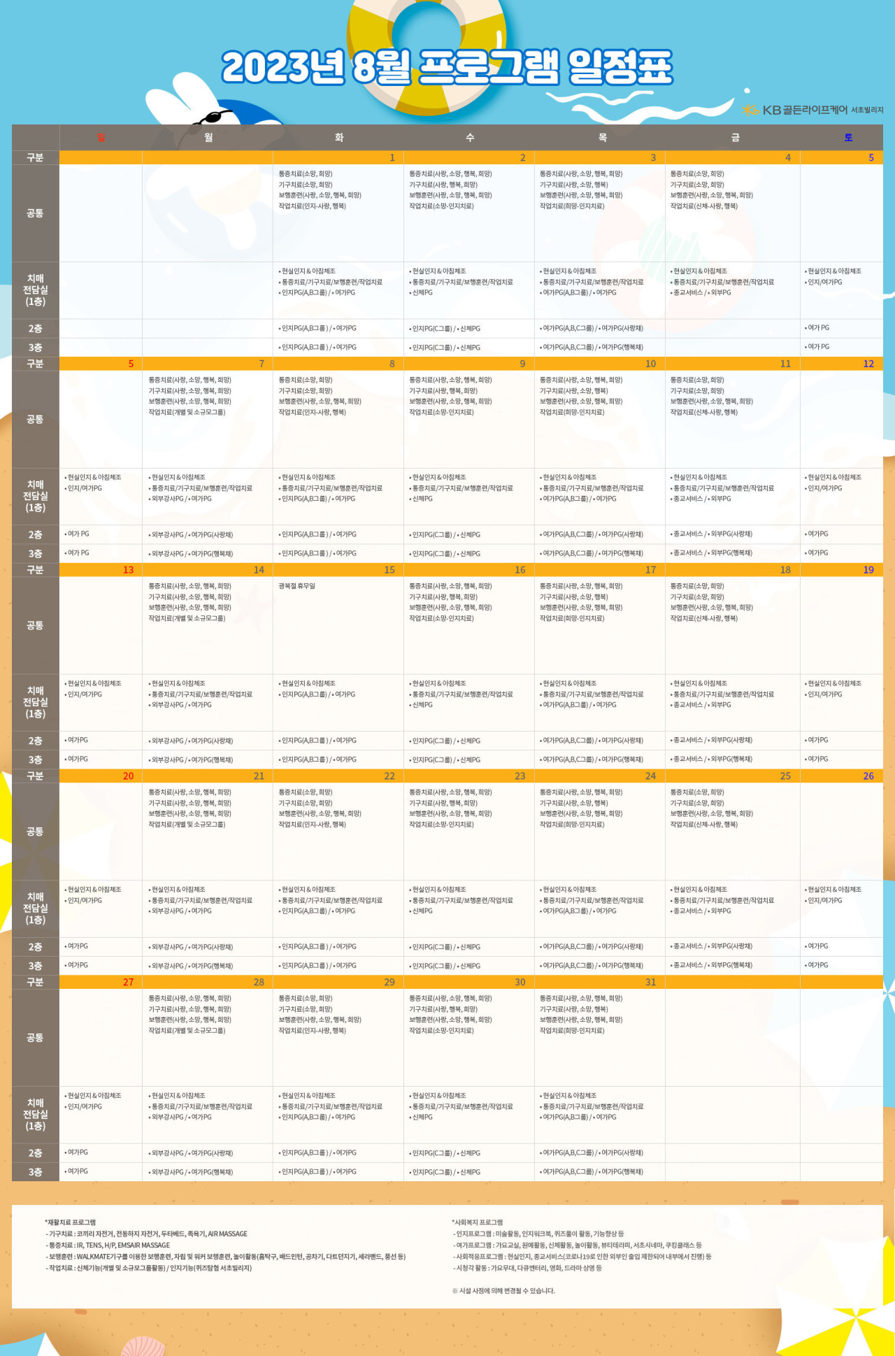 서초빌리지 [프로그램안내] 2023년 서초 빌리지 8월 프로그램 일정표 페이지 정보 작성자 KB 골든라이프케어 댓글 0건 조회 3,627회 작성일 23-08-01 13:46 목록 본문 목록 이전글[영양교육] 고혈압 및 식이요령 23.08.02 다음글[식단안내] 2023년 강동케어센터 8월 식단표 23.07.28